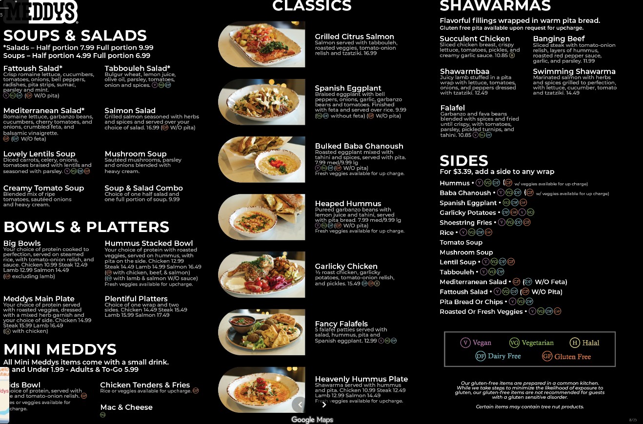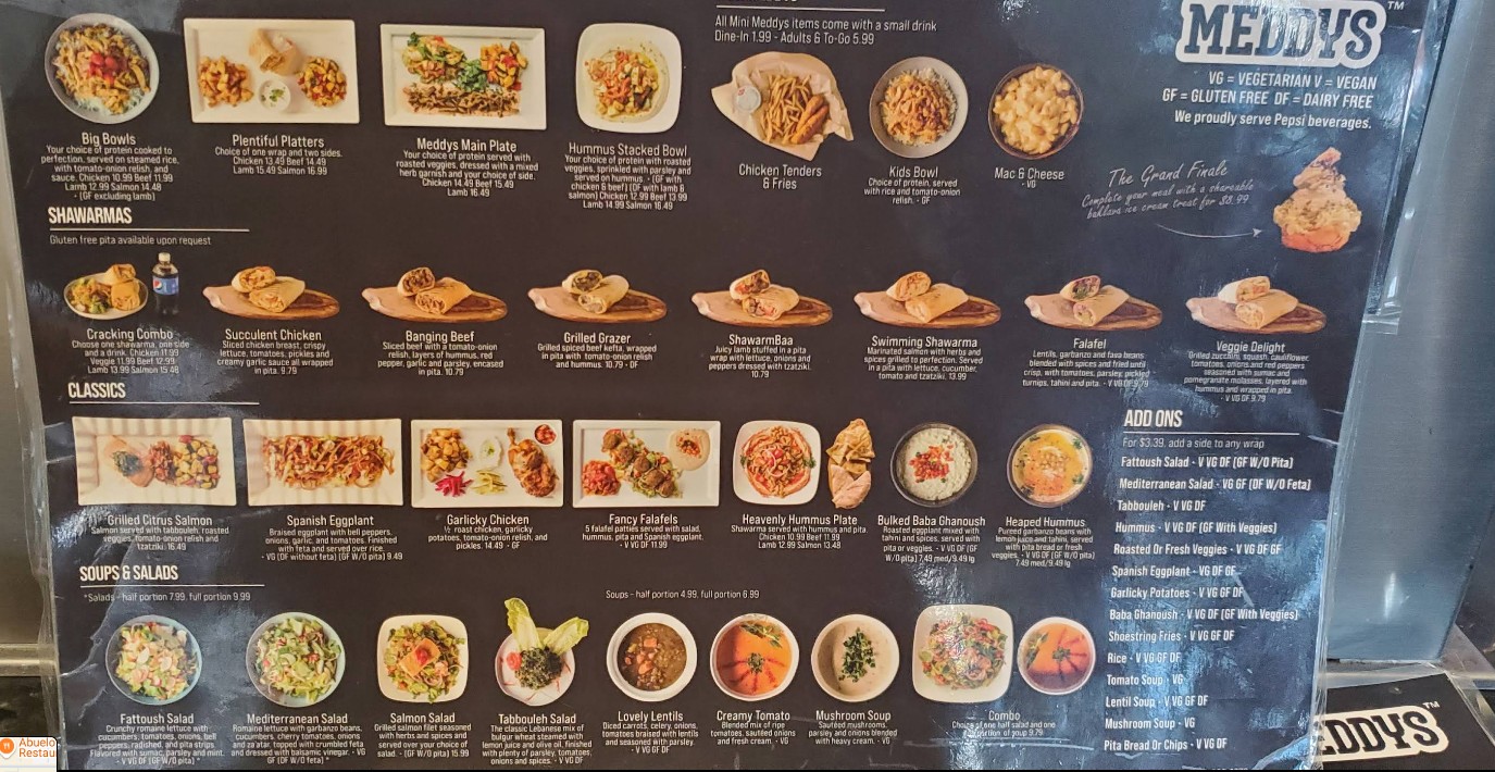 Welcome to Meddys Restaurant, your go-to destination for vibrant Mediterranean flavors! Our menu features a variety of healthy and fresh options including savory hummus, crispy falafel, and grilled chicken and lamb. Whether you're looking for a quick bite or a sit-down meal, we offer an inviting atmosphere and a delicious dining experience. Join us today and taste the best of Mediterranean cuisine, right here at Meddys!